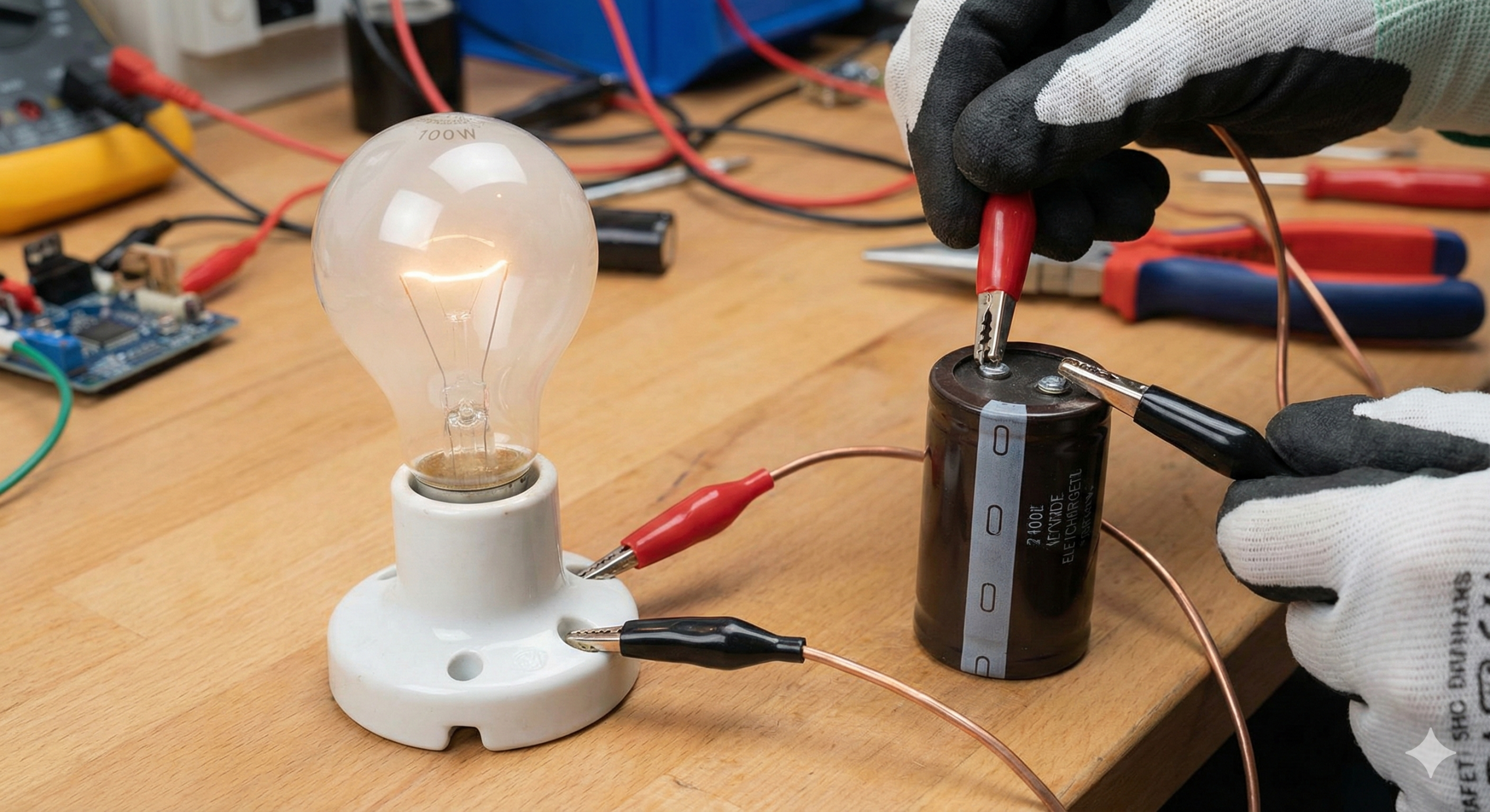 Setup Mount a standard incandescent light bulb (e.g., 100W for mains capacitors) into a socket equipped with two insulated wire leads.