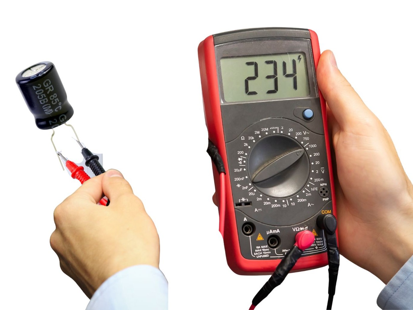 - Set your digital multimeter to DC Voltage (VDC) mode. Ensure the range is higher than the capacitor’s rated voltage.