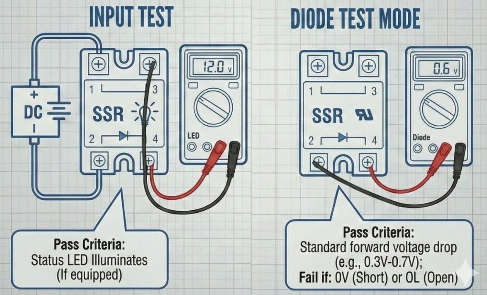 Solid State Relays are different; they have no moving parts, so the standard “click” test does not apply. Testing these requires a different mindset.
