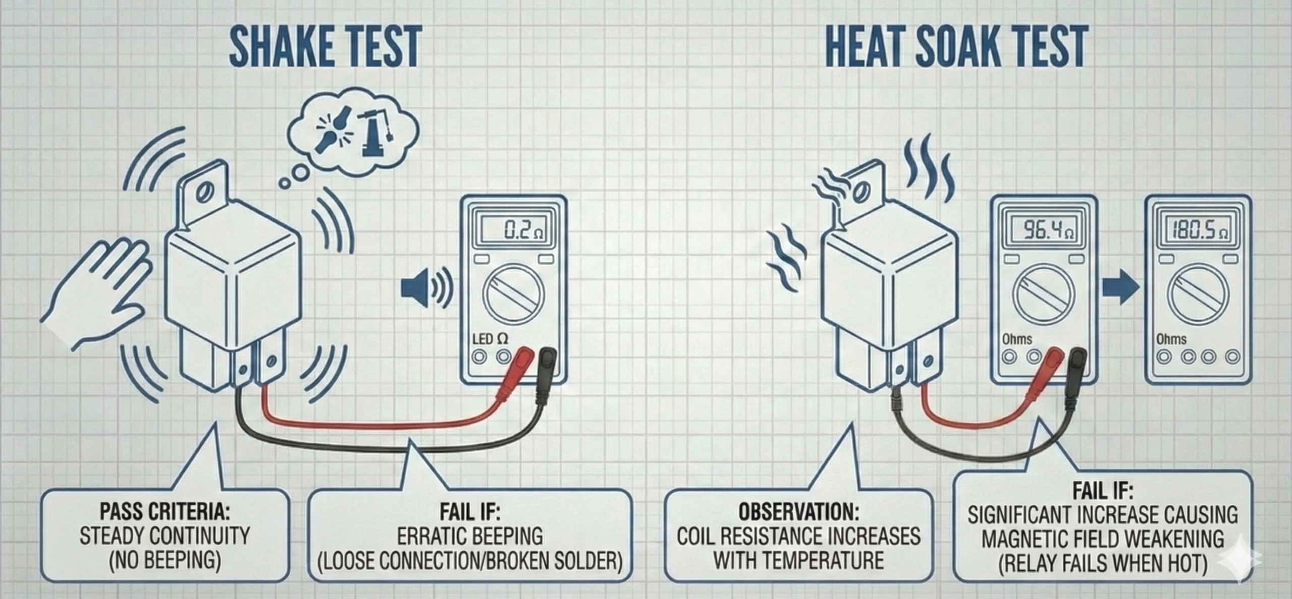 - Heat Soak: I have observed that coil resistance increases with temperature. A relay might work on a cold bench but fail in a hot engine bay. Heating the relay slightly (using a heat gun on low or simply re-testing after it has been active) can reveal thermal failures where the magnetic field becomes too weak to pull the switch.