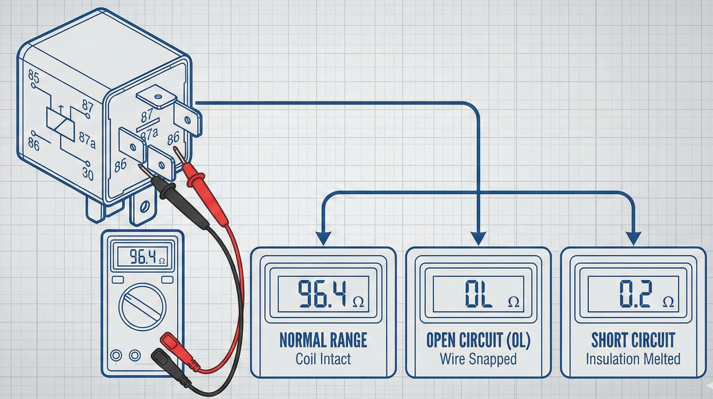 - Open Circuit (OL): If the meter reads “OL” (Open Loop), the internal wire has snapped. The relay is dead and requires replacement.