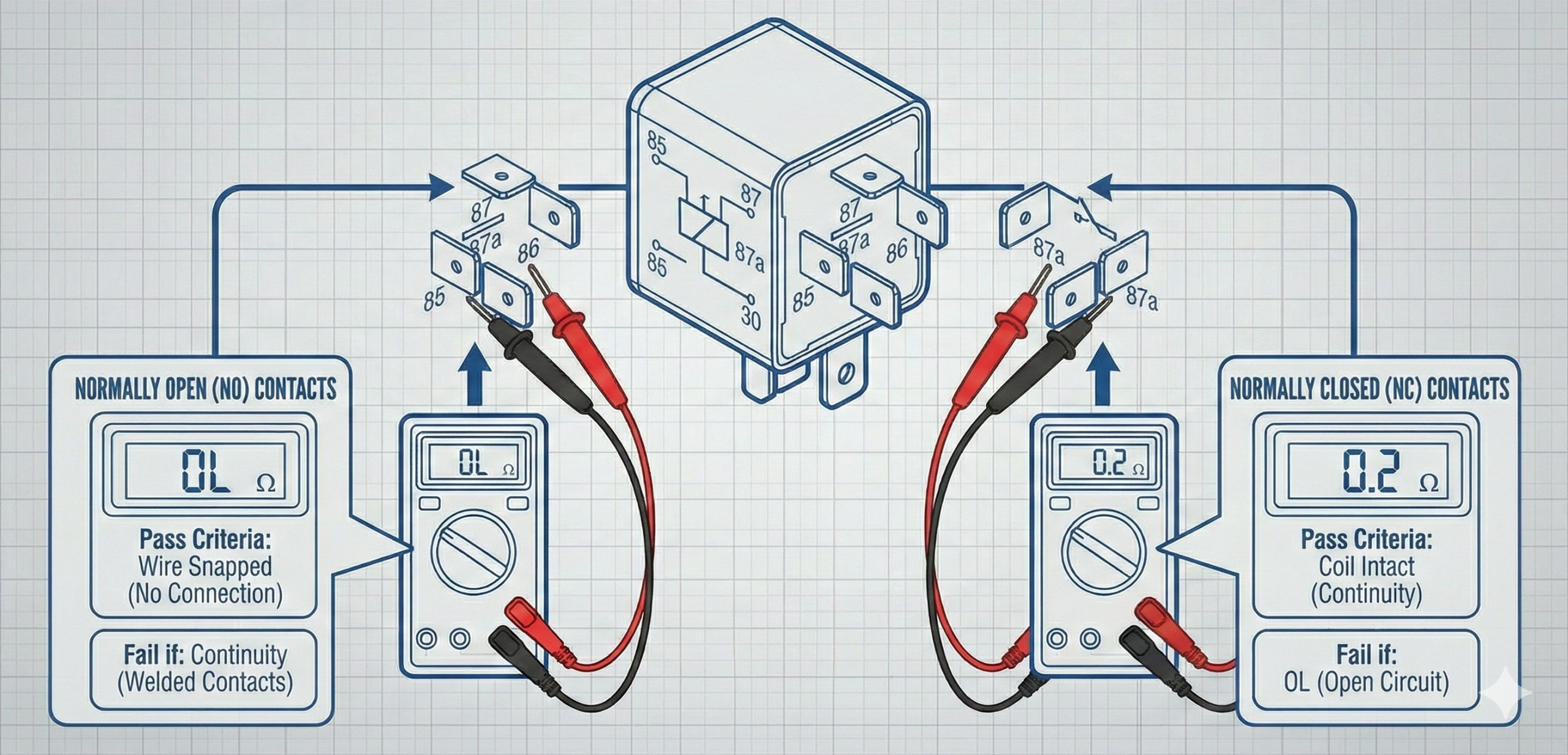 - Pass Criteria: Since the relay is not energized, there should be no connection. The meter must read “OL” or infinite resistance. If there is continuity here, the contacts have likely welded together due to high current arcing.