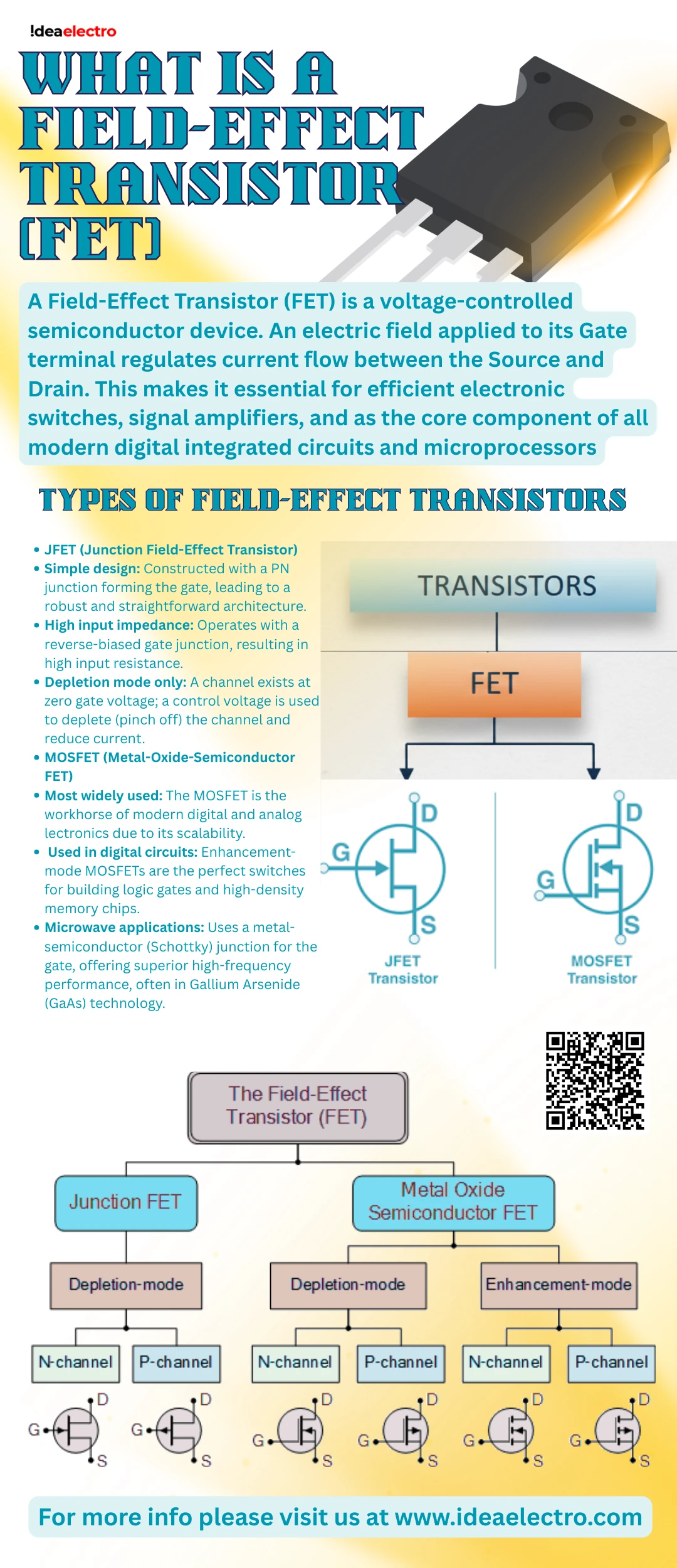 A Field-Effect Transistor (FET) is a foundational semiconductor device that has shaped modern electronics. Unlike its predecessor, the Bipolar Junction Transistor (BJT), the FET is a voltage-controlled device. This means the current flowing through its main channel is regulated by the voltage applied to a control terminal, not by an input current. This core operational difference gives the FET its most celebrated trait: an extremely high input impedance. The high input impedance allows FETs to interface with sensors and other circuit stages without drawing significant current, making them ideal for building efficient and sensitive electronic systems. Their unique properties have made FETs, particularly the Metal-Oxide-Semiconductor FET (MOSFET), the dominant transistor in digital integrated circuits, forming the building blocks of modern microprocessors and memory chips.