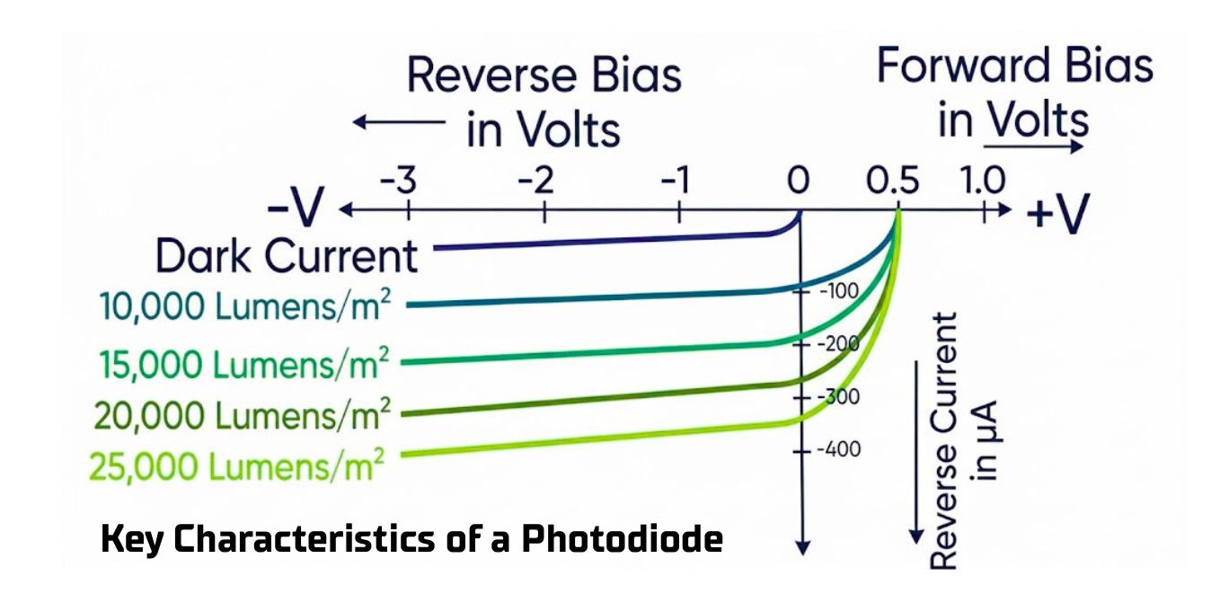 • Dark Current: The small current that flows through the reverse-biased photodiode even in complete darkness. It is a primary source of noise and increases with temperature.