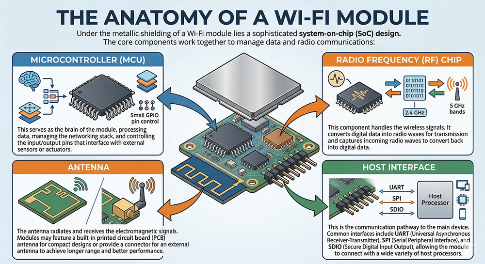 Under the metallic shielding of a Wi-Fi module lies a sophisticated system-on-chip (SoC) design. The core components work together to manage data and radio communications: