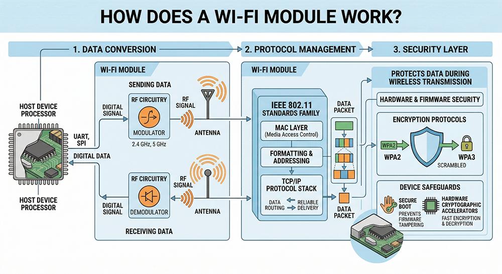 The functionality of a Wi-Fi module is a process of conversion and protocol management. The process can be broken down into three distinct stages: