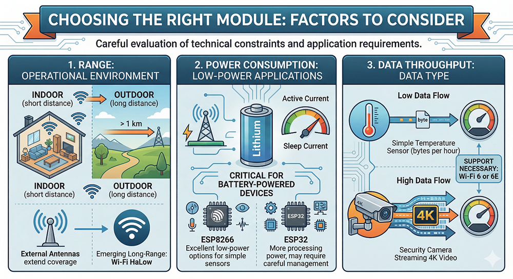 Selecting the appropriate Wi-Fi module for a project requires a careful evaluation of technical constraints and application requirements. Developers should consider the following: